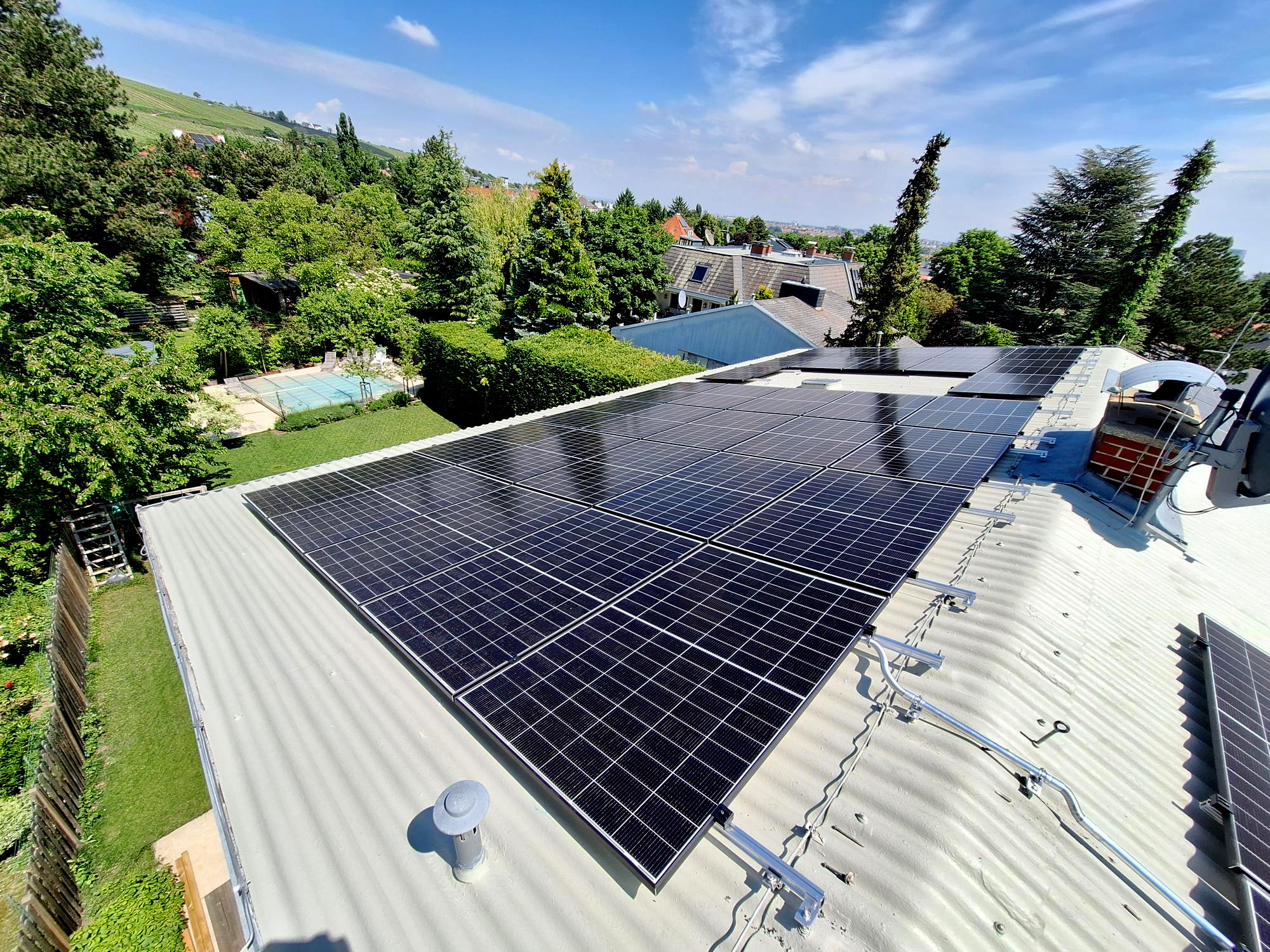 Auf diesem Welleternitdach wurde die Unterkonstruktion sicher mit Stockschrauben montiert, sodass die leistungsstarke Photovoltaikanlage stabil und langlebig installiert ist. Dank der speziellen Konzeption für das Dach mit geringer Neigung wird der Solarstrom optimal erzeugt und genutzt – perfekt ergänzt durch den 21 kWh Batteriespeicher.